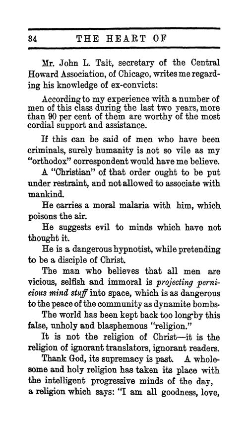 Thank God, its supremacy is past. A wholesome and holy religion has taken its place with the intelligent progressive minds of the day, a religion which says: "I am all goodness, love,