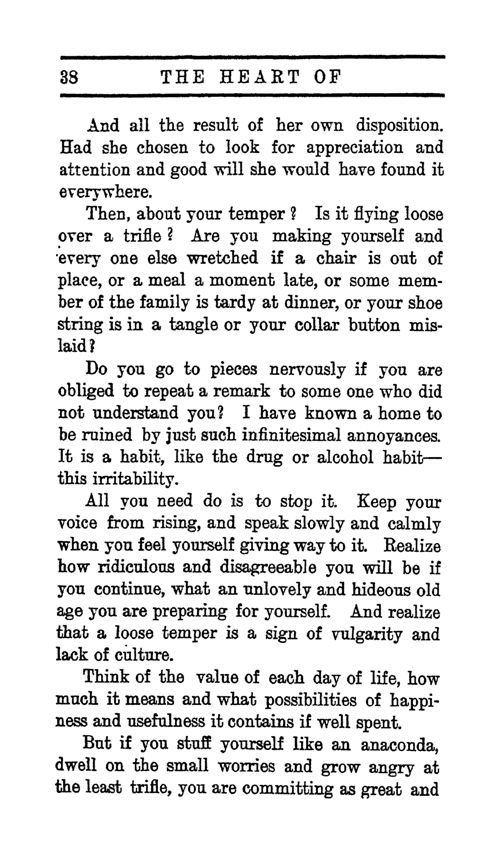 Do you go to pieces nervously if you are obliged to repeat a remark to someone who did not understand you? I have known a home to be ruined by just such infinitesimal annoyances. It is a habit, like the drug or alcohol habit -- this irritability.