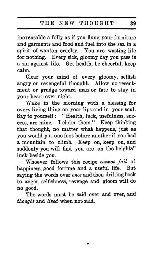 inexcusable a folly as if you flung your furniture and garments and food and fuel into the sea in a spirit of wanton cruelty. You are wasting life for nothing. Every sick, gloomy day you pass is a sin against life. Get health, be cheerful, keep calm.