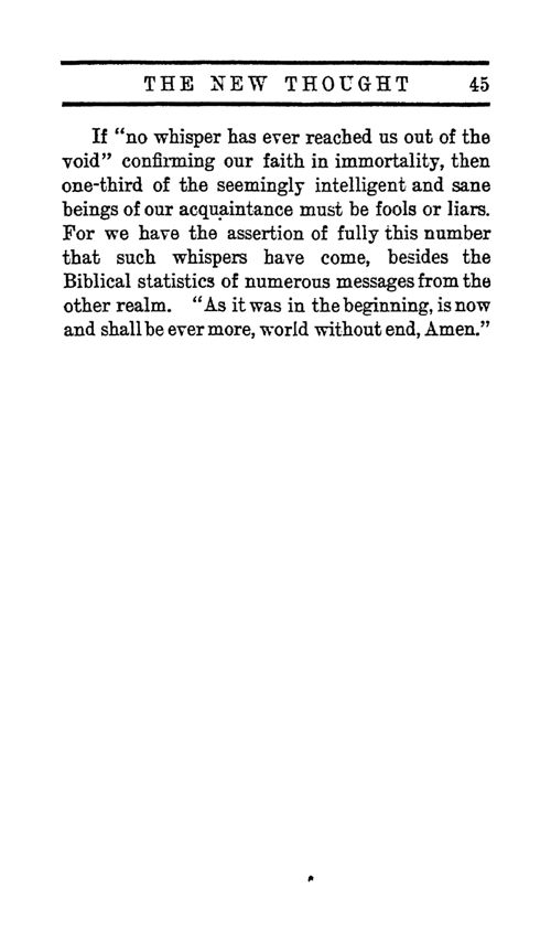 If "no whisper has ever reached us out of the void" confirming our faith in immortality, then one-third of the seemingly intelligent and sane beings of our acquaintance must be fools or liars. For we have the assertion of fully this number that such whispers have come, besides the Biblical statistics of numerous messages from the other realm. "As it was in the beginning, is now and shall be ever more, world without end, Amen."