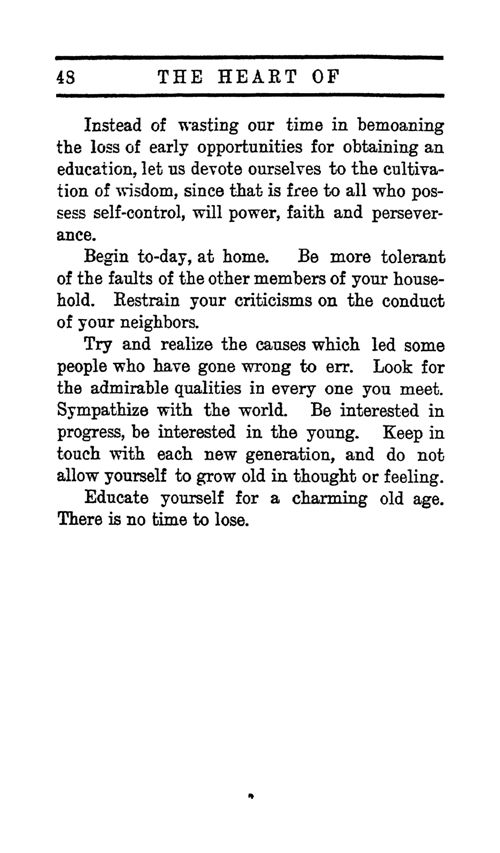 Instead of wasting our time in bemoaning the loss of early opportunities for obtaining an education, let us devote ourselves to the cultivation of wisdom, since that is free to all who possess self-control, will power, faith and perseverance.