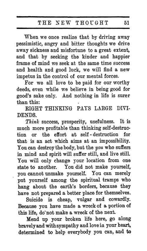 Think success, prosperity, usefulness. It is much more profitable than thinking self-destruction or the effort at self-destruction for that is an act which aims at an impossibility. You can destroy the body, but the you who suffers in mind and spirit will suffer still, and live still. You will only change your location from one state to another. You did not make yourself, you cannot unmake yourself. You can merely put yourself among the spiritual tramps who hang about the earth's borders, because they have not prepared a better place for themselves.