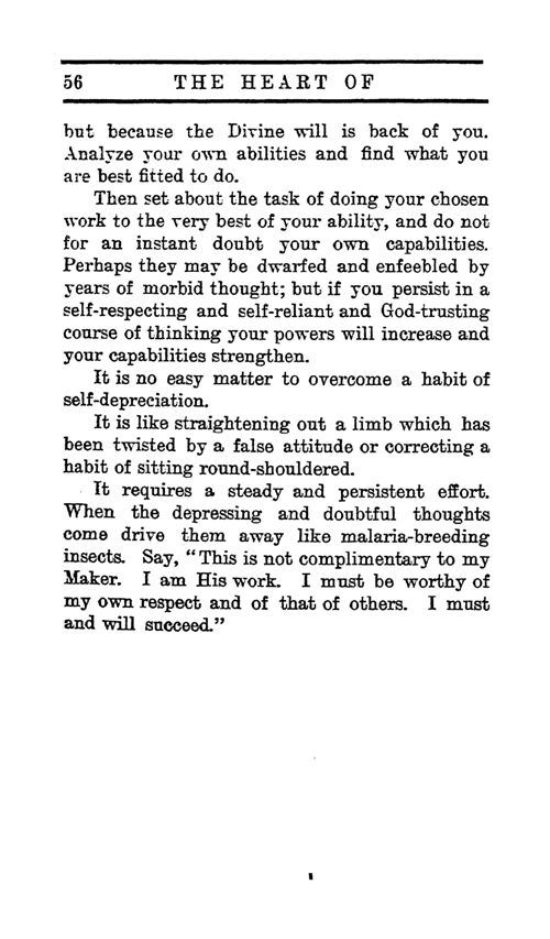 It requires a steady and persistent effort. When the depressing and doubtful thoughts come, drive them away like malaria-breeding insects. Say, "This is not complimentary to my Maker. I am His work. I must be worthy of my own respect and of that of others. I must and will succeed."
