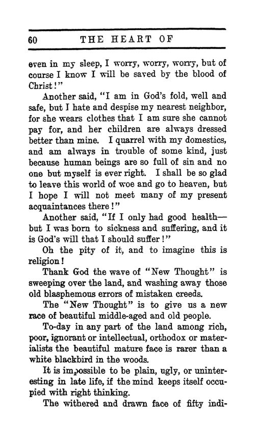 The "New Thought" is to give us a new race of beautiful middle-aged and old people. Today in any part of the land among rich, poor, ignorant or intellectual, orthodox or materialists the beautiful mature face is rarer than a white blackbird in the woods.