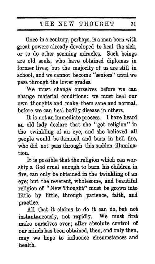 It is possible that the religion which can worship a God cruel enough to bum his children in fire, can only be obtained in the twinkling of an eye; but the reverent, wholesome, and beautiful religion of "New Thought" must be grown into little by little, through patience, faith, and practice.