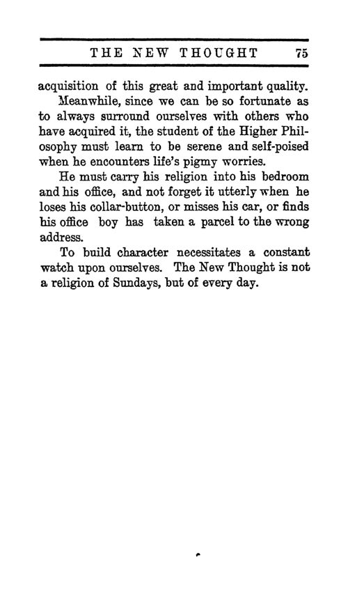 To build character necessitates a constant watch upon ourselves. The New Thought is not a religion of Sundays, but of every day.