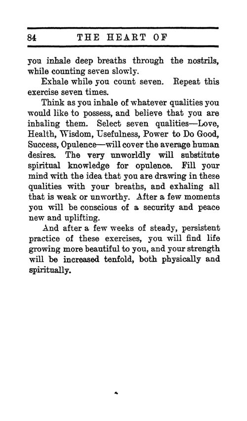 Think as you inhale of whatever qualities you would like to possess, and believe that you are inhaling them. Select seven qualities -- Love, Health, Wisdom, Usefulness, Power to Do Good, Success, Opulence -- will cover the average human desires. The very unworldly will substitute spiritual knowledge for opulence. Fill your mind with the idea that you are drawing in these qualities with your breaths, and exhaling all that is weak or unworthy. After a few moments you will be conscious of a security and peace new and uplifting.