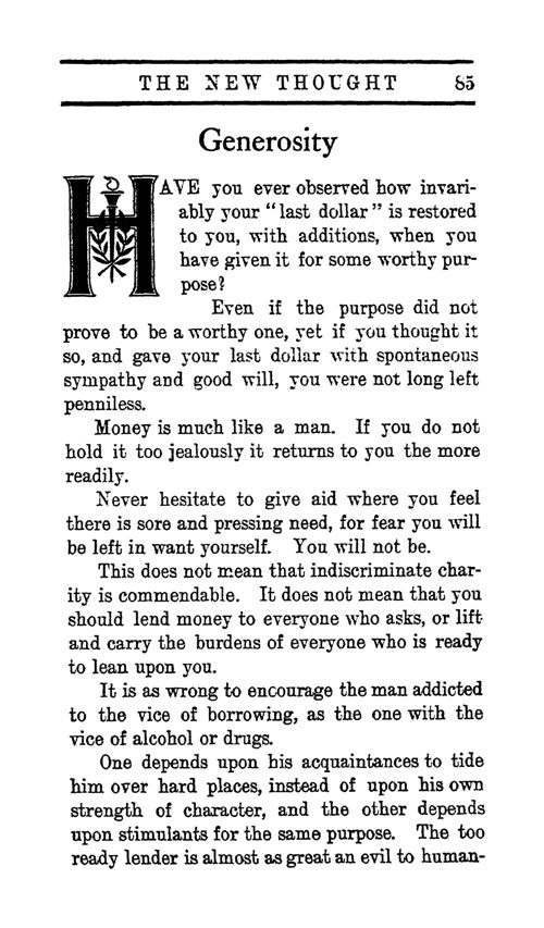 Even if the purpose did not prove to be a worthy one, yet if you thought it so, and gave your last dollar with spontaneous sympathy and good will, you were not long left penniless.