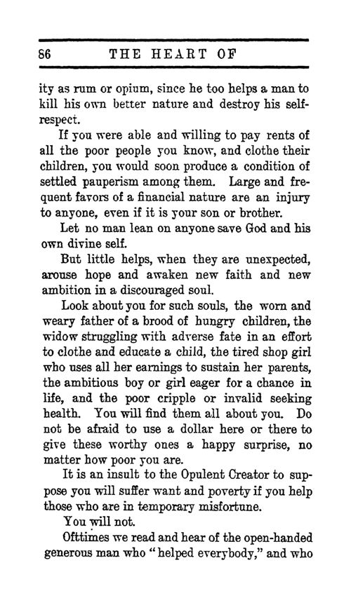 Look about you for such souls, the worn and weary father of a brood of hungry children, the widow struggling with adverse fate in an effort to clothe and educate a child, the tired shop girl who uses all her earnings to sustain her parents, the ambitious boy or girl eager for a chance in life, and the poor cripple or invalid seeking health. You will find them all about you. Do not be afraid to use a dollar here or there to give these worthy ones a happy surprise, no matter how poor you are.