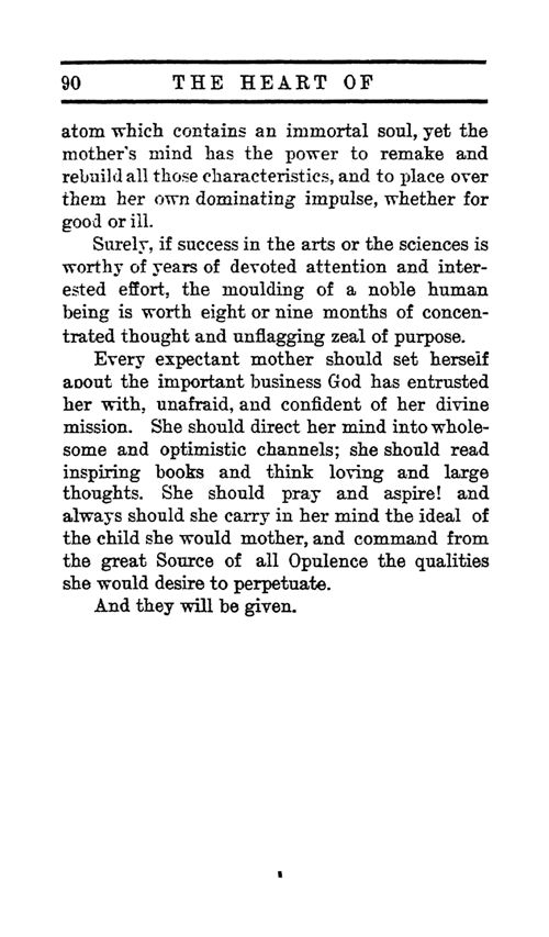 atom which contains an immortal soul, yet the mother's mind has the power to remake and rebuild all those characteristics, and to place over them her own dominating impulse, whether for good or ill.