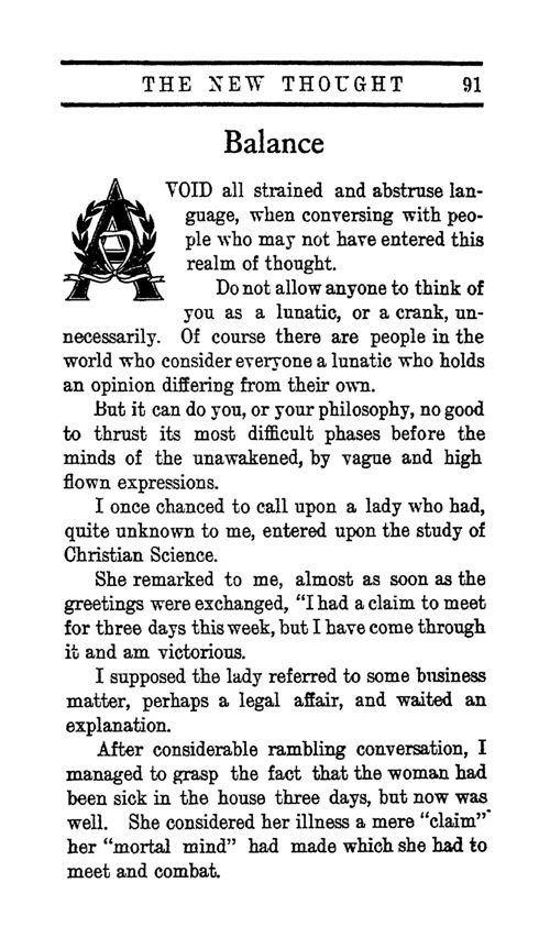 After considerable rambling conversation, I managed to grasp the fact that the woman had been sick in the house three days, but now was well. She considered her illness a mere "claim" her "mortal mind" had made which she had to meet and combat.