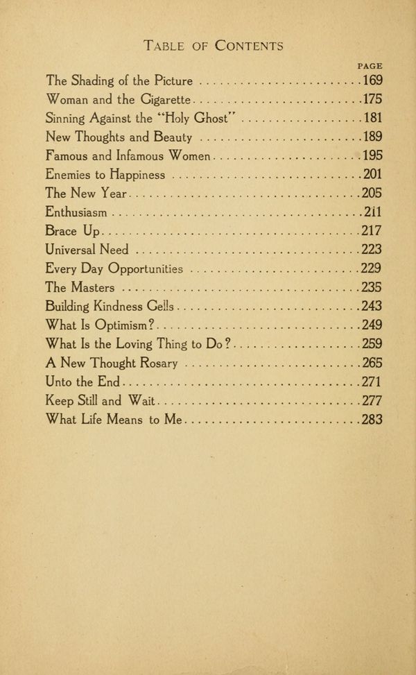 The Ancient Lineage of New Thought - The Anti-toxin of Common Sense - Are You Doing the Best You Can? - Be Not Easily Offended - For What Are You Living? - Ignore Misfortune - The Power of Personality - Common Sense and "Goodness" - "Good Business" - The Trapeze Performer - The High Calling of Fatherhood - The High Calling of Motherhood - Thought Building for Children - The New Thought Economy - What Is a Good Woman? - The Color of Your Thoughts - "In God We Trust" - Are You Alive? - Something About Celibacy - The Old and the New Thought View of Life - The Cities Beyond - The Onward March - Common Sense Ideas in Marriage - The Shading of the Picture - Woman and the Cigarette - Sinning Against the "Holy Ghost" - New Thoughts and Beauty - Famous and Infamous Women - Enemies to Happiness - The New Year - Enthusiasm - Brace Up - Universal Need - Every Day Opportunities - The Masters - Building Kindness Cells - What Is Optimism? - What Is the Loving Thing to Do? - A New Thought Rosary - Unto the End - Keep Still and Wait - What Life Means to Me - Contents - Index