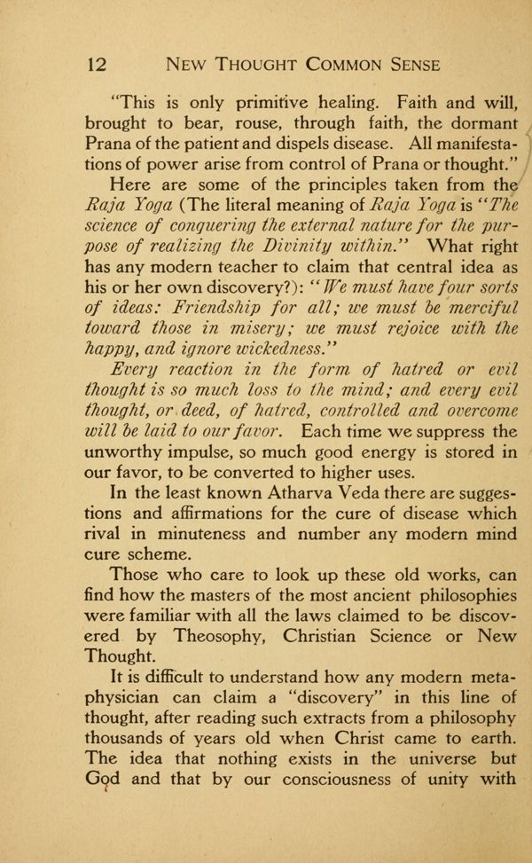 In the least known Atharva Veda there are suggestions and affirmations for the cure of disease which rival in minuteness and number any modern mind cure scheme.