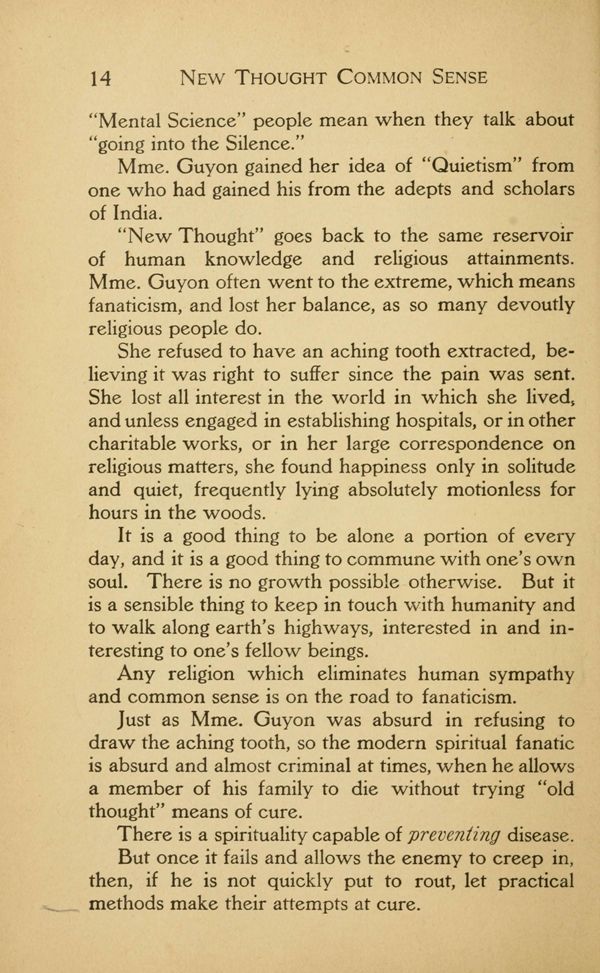 Mme. Guyon gained her idea of "Quietism" from one who had gained his from the adepts and scholars of India. "New Thought" goes back to the same reservoir of human knowledge and religious attainments. Mme. Guyon often went to the extreme, which means fanaticism, and lost her balance, as so many devoutly religious people do.