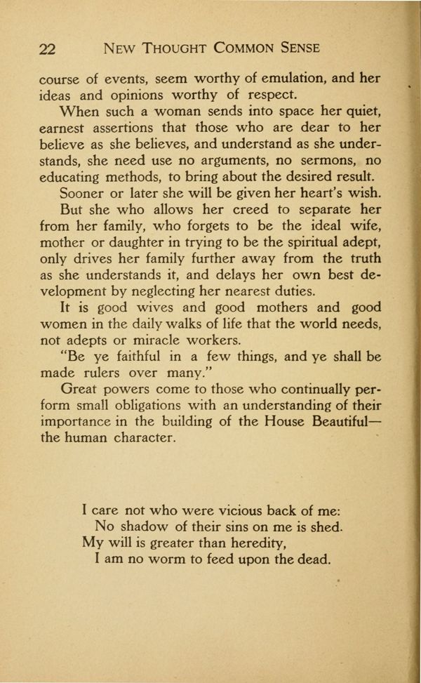 Sooner or later she will be given her heart's wish. But she who allows her creed to separate her from her family, who forgets to be the ideal wife, mother or daughter in trying to be the spiritual adept, only drives her family further away from the truth as she understands it, and delays her own best development by neglecting her nearest duties.