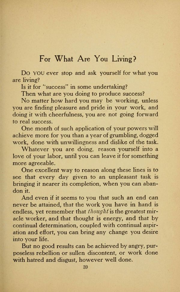 One month of such application of your powers will achieve more for you than a year of grumbling, dogged work, done with unwillingness and dislike of the task. Whatever you are doing, reason yourself into a love of your labor, until you can leave it for something more agreeable.