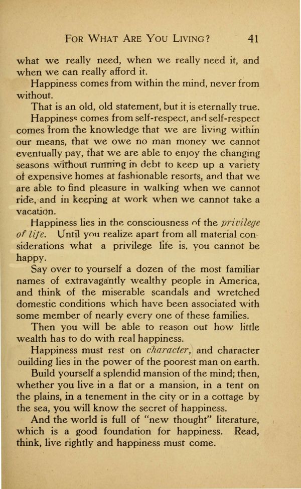Happiness comes from self-respect, and self-respect comes from the knowledge that we are living within our means, that we owe no man money we cannot eventually pay, that we are able to enjoy the changing seasons without running in debt to keep up a variety of expensive homes at fashionable resorts, and that we are able to find pleasure in walking when we cannot ride, and in keeping at work when we cannot take a vacation.