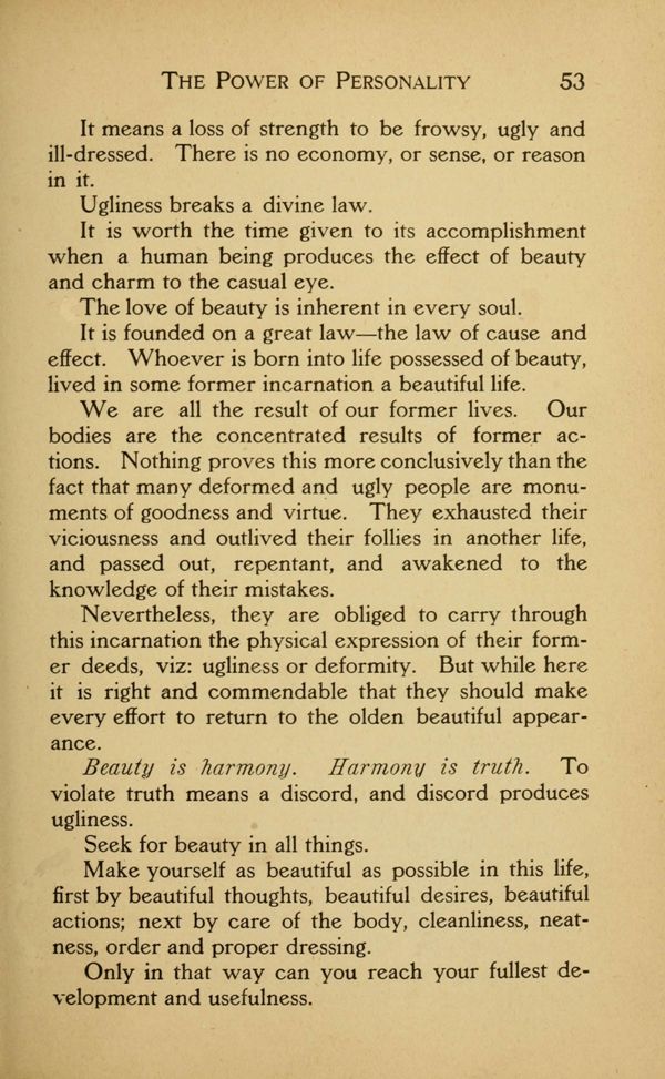 Nevertheless, they are obliged to carry through this incarnation the physical expression of their former deeds, viz: ugliness or deformity. But while here it is right and commendable that they should make every effort to return to the olden beautiful appearance.