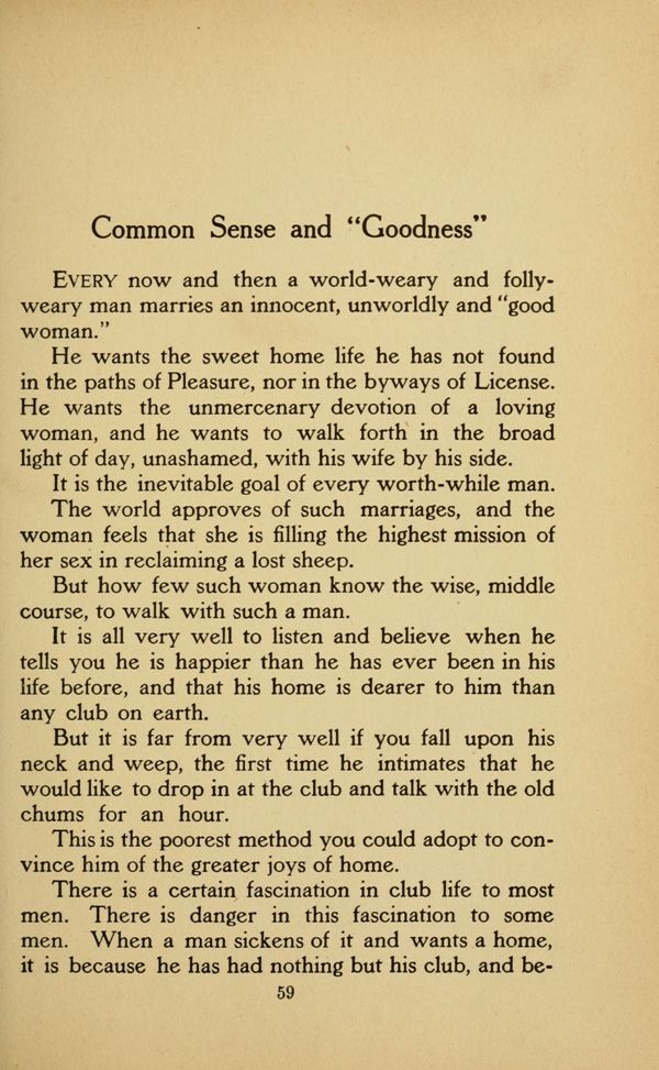 It is the inevitable goal of every worth-while man. The world approves of such marriages, and the woman feels that she is filling the highest mission of her sex in reclaiming a lost sheep.