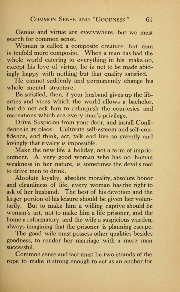 Absolute loyalty, absolute morality, absolute honor and cleanliness of life, every woman has the right to ask of her husband. The best of his devotion and the larger portion of his leisure should be given her voluntarily. But to make him a willing captive should be woman's art, not to make him a life prisoner, and the home a reformatory, and the wife a suspicious warden, always imagining that the prisoner is planning escape. The good wife must possess other qualities besides goodness, to render her marriage with a mere man successful.