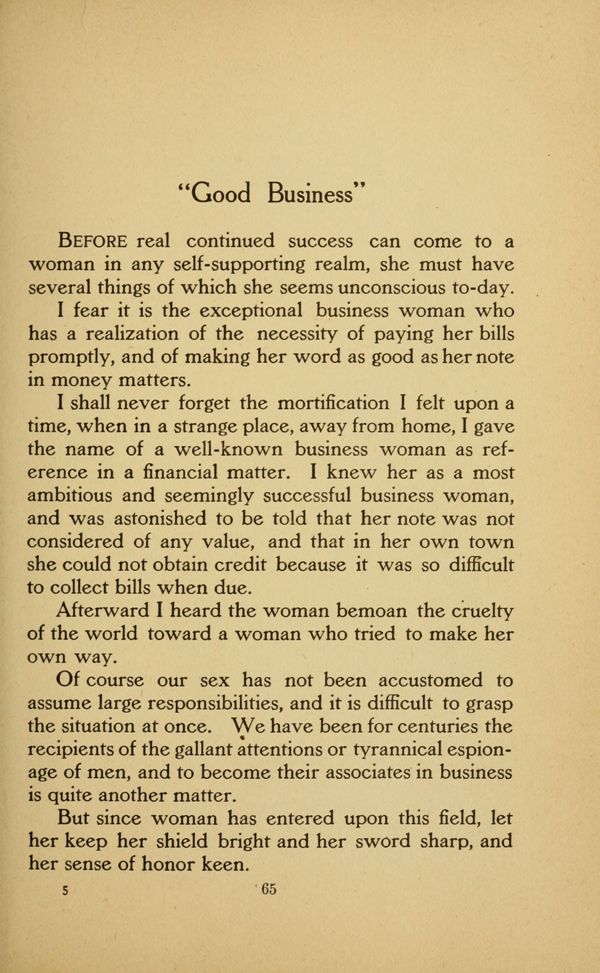 I shall never forget the mortification I felt upon a time, when in a strange place, away from home, I gave the name of a well-known business woman as reference in a financial matter. I knew her as a most ambitious and seemingly successful business woman, and was astonished to be told that her note was not considered of any value, and that in her own town she could not obtain credit because it was so difficult to collect bills when due.