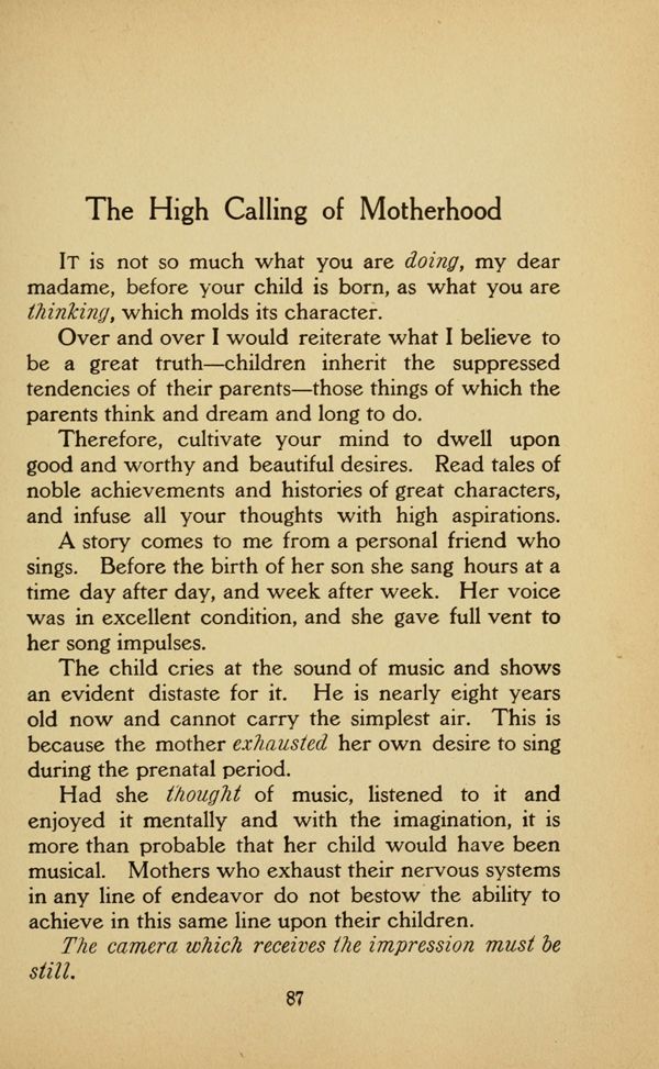 Had she thought of music, listened to it and enjoyed it mentally and with the imagination, it is more than probable that her child would have been musical. Mothers who exhaust their nervous systems in any line of endeavor do not bestow the ability to achieve in this same line upon their children.