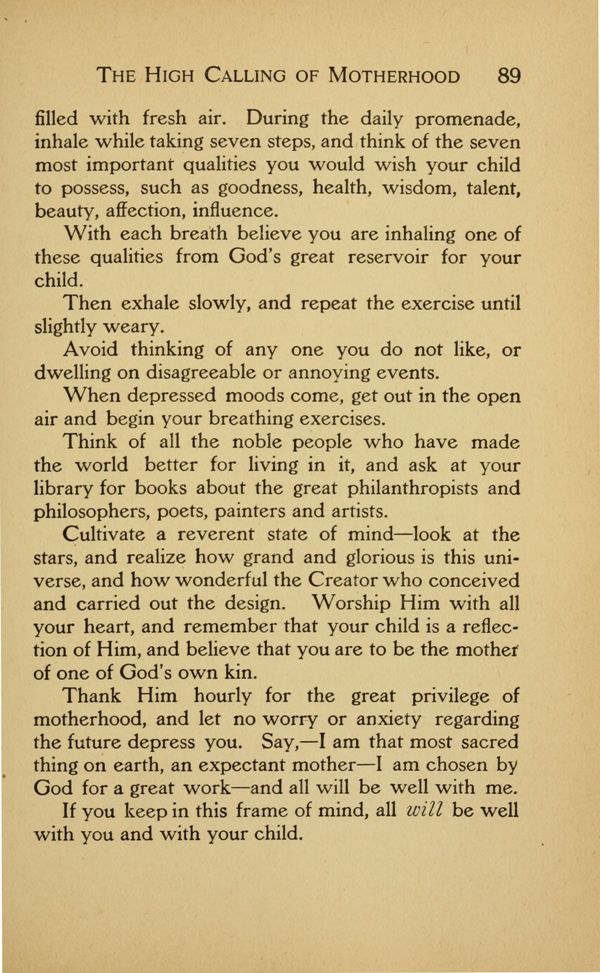 Thank Him hourly for the great privilege of motherhood, and let no worry or anxiety regarding the future depress you. Say, --- I am that most sacred thing on earth, an expectant mother --- I am chosen by God for a great work --- and all will be well with me.