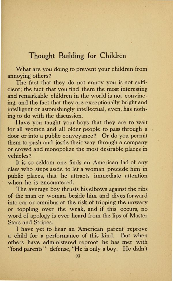 Have you taught your boys that they are to wait for all women and all older people to pass through a door or into a public conveyance ? Or do you permit them to push and jostle their way through a company or crowd and monopolize the most desirable places in vehicles?