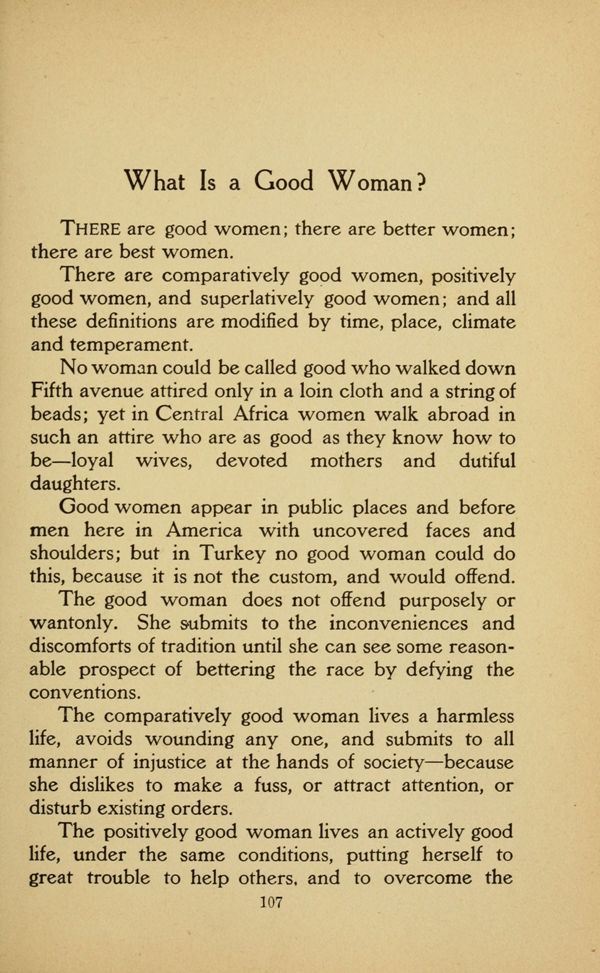 The comparatively good woman lives a harmless life, avoids wounding any one, and submits to all manner of injustice at the hands of society --- because she dislikes to make a fuss, or attract attention, or disturb existing orders.