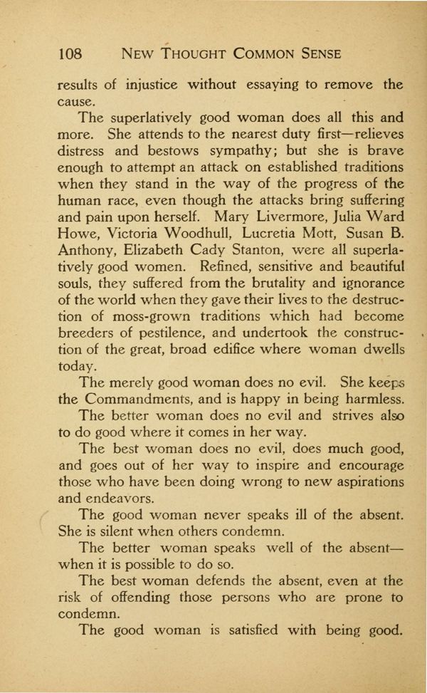 The superlatively good woman does all this and more. She attends to the nearest duty first --- relieves distress and bestows sympathy; but she is brave enough to attempt an attack on established traditions when they stand in the way of the progress of the human race, even though the attacks bring suffering and pain upon herself. Mary Livermore, Julia Ward Howe, Victoria Woodhull, Lucretia Mott, Susan B. Anthony, Elizabeth Cady Stanton, were all superlatively good women. Refined, sensitive and beautiful souls, they suffered from the brutality and ignorance of the world when they gave their lives to the destruction of moss-grown traditions which had become breeders of pestilence, and undertook the construction of the great, broad edifice where woman dwells today.