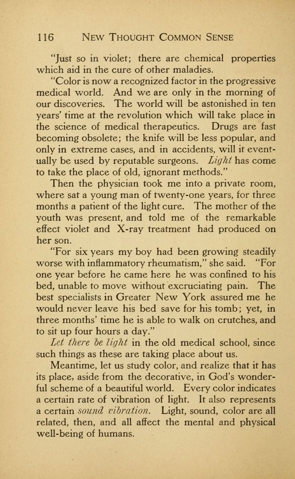 "Color is now a recognized factor in the progressive medical world. And we are only in the morning of our discoveries. The world will be astonished in ten years' time at the revolution which will take place in the science of medical therapeutics. Drugs are fast becoming obsolete; the knife will be less popular, and only in extreme cases, and in accidents, will it eventually be used by reputable surgeons. Light has come to take the place of old, ignorant methods."