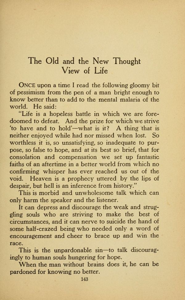The Ancient Lineage of New Thought - The Anti-toxin of Common Sense - Are You Doing the Best You Can? - Be Not Easily Offended - For What Are You Living? - Ignore Misfortune - The Power of Personality - Common Sense and "Goodness" - "Good Business" - The Trapeze Performer - The High Calling of Fatherhood - The High Calling of Motherhood - Thought Building for Children - The New Thought Economy - What Is a Good Woman? - The Color of Your Thoughts - "In God We Trust" - Are You Alive? - Something About Celibacy - The Old and the New Thought View of Life - The Cities Beyond - The Onward March - Common Sense Ideas in Marriage - The Shading of the Picture - Woman and the Cigarette - Sinning Against the "Holy Ghost" - New Thoughts and Beauty - Famous and Infamous Women - Enemies to Happiness - The New Year - Enthusiasm - Brace Up - Universal Need - Every Day Opportunities - The Masters - Building Kindness Cells - What Is Optimism? - What Is the Loving Thing to Do? - A New Thought Rosary - Unto the End - Keep Still and Wait - What Life Means to Me - Contents - Index