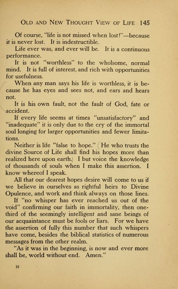 Neither is life "false to hope." He who trusts the divine Source of Life shall find his hopes more than realized here upon earth. I but voice the knowledge of thousands of souls when I make this assertion. I know whereof I speak.