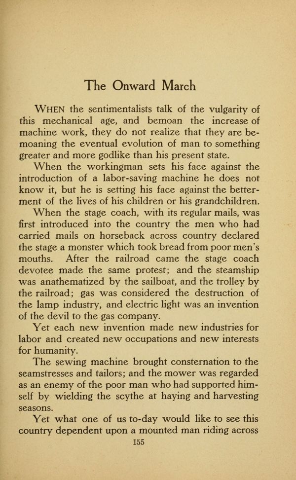 When the stage coach, with its regular mails, was first introduced into the country the men who had carried mails on horseback across country declared the stage a monster which took bread from poor men's mouths. After the railroad came the stage coach devotee made the same protest; and the steamship was anathematized by the sailboat, and the trolley by the railroad; gas was considered the destruction of the lamp industry, and electric light was an invention of the devil to the gas company.