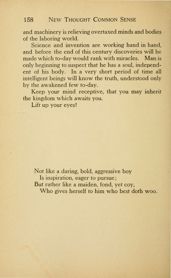 Science and invention are working hand in hand, and before the end of this century discoveries will be made which to-day would rank with miracles. Man is only beginning to suspect that he has a soul, independent of his body. In a very short period of time all intelligent beings will know the truth, understood only by the awakened few to-day.