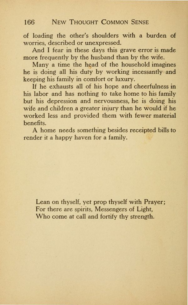 The Ancient Lineage of New Thought - The Anti-toxin of Common Sense - Are You Doing the Best You Can? - Be Not Easily Offended - For What Are You Living? - Ignore Misfortune - The Power of Personality - Common Sense and "Goodness" - "Good Business" - The Trapeze Performer - The High Calling of Fatherhood - The High Calling of Motherhood - Thought Building for Children - The New Thought Economy - What Is a Good Woman? - The Color of Your Thoughts - "In God We Trust" - Are You Alive? - Something About Celibacy - The Old and the New Thought View of Life - The Cities Beyond - The Onward March - Common Sense Ideas in Marriage - The Shading of the Picture - Woman and the Cigarette - Sinning Against the "Holy Ghost" - New Thoughts and Beauty - Famous and Infamous Women - Enemies to Happiness - The New Year - Enthusiasm - Brace Up - Universal Need - Every Day Opportunities - The Masters - Building Kindness Cells - What Is Optimism? - What Is the Loving Thing to Do? - A New Thought Rosary - Unto the End - Keep Still and Wait - What Life Means to Me - Contents - Index