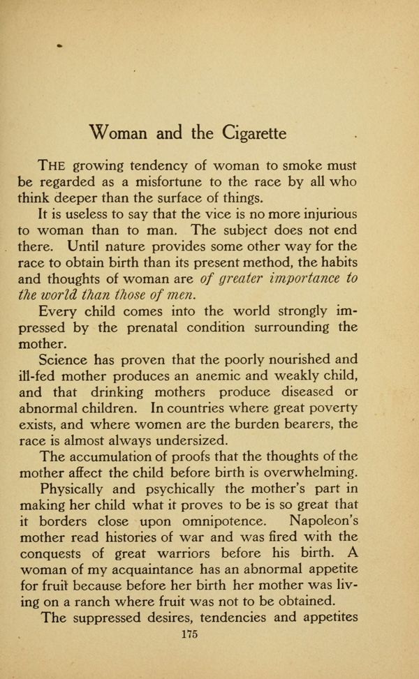 The accumulation of proofs that the thoughts of the mother affect the child before birth is overwhelming. Physically and psychically the mother's part in making her child what it proves to be is so great that it borders close upon omnipotence. Napoleon's mother read histories of war and was fired with the conquests of great warriors before his birth. A woman of my acquaintance has an abnormal appetite for fruit because before her birth her mother was living on a ranch where fruit was not to be obtained. The suppressed desires, tendencies and appetites