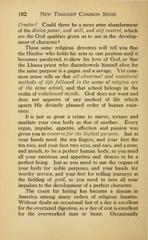 These same religious devotees will tell you that the Hindoo who holds his arm in one position until it becomes paralyzed, to show his love of God, or that the Lhassa priest who disembowels himself alive for the same purpose is a pagan and a savage. Yet common sense tells us that all abnormal and unnatural methods of life followed in the name of religion are of the same school, and that school belongs in the realm of unbalanced minds. God does not want and does not approve of any method of life which upsets His divinely planned order of human existence.