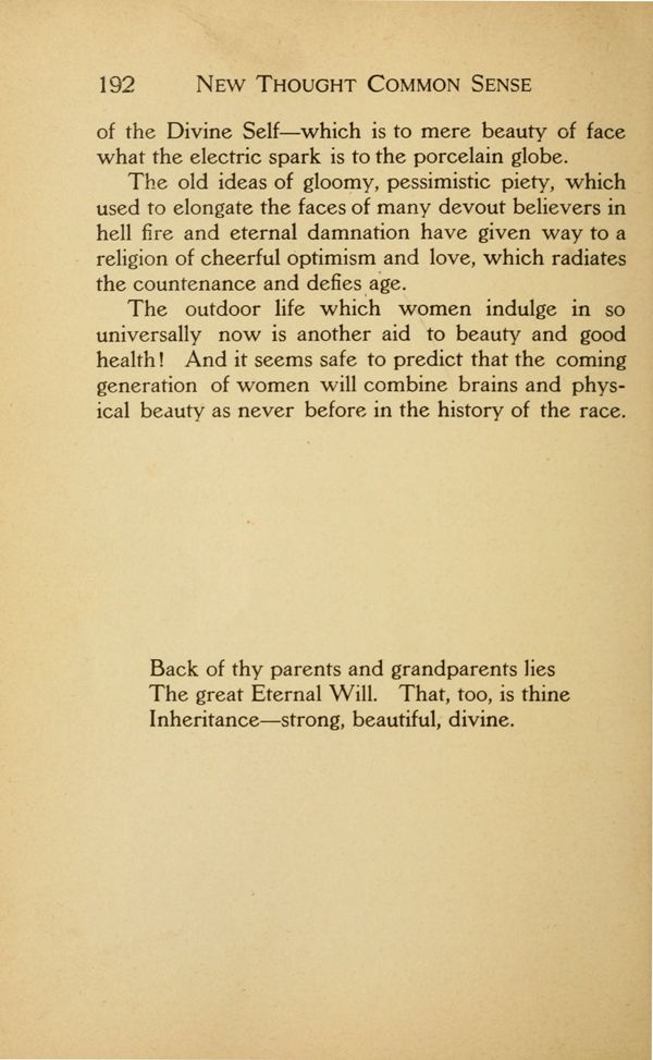 The Ancient Lineage of New Thought - The Anti-toxin of Common Sense - Are You Doing the Best You Can? - Be Not Easily Offended - For What Are You Living? - Ignore Misfortune - The Power of Personality - Common Sense and "Goodness" - "Good Business" - The Trapeze Performer - The High Calling of Fatherhood - The High Calling of Motherhood - Thought Building for Children - The New Thought Economy - What Is a Good Woman? - The Color of Your Thoughts - "In God We Trust" - Are You Alive? - Something About Celibacy - The Old and the New Thought View of Life - The Cities Beyond - The Onward March - Common Sense Ideas in Marriage - The Shading of the Picture - Woman and the Cigarette - Sinning Against the "Holy Ghost" - New Thoughts and Beauty - Famous and Infamous Women - Enemies to Happiness - The New Year - Enthusiasm - Brace Up - Universal Need - Every Day Opportunities - The Masters - Building Kindness Cells - What Is Optimism? - What Is the Loving Thing to Do? - A New Thought Rosary - Unto the End - Keep Still and Wait - What Life Means to Me - Contents - Index