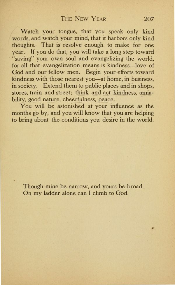 Watch your tongue, that you speak only kind words, and watch your mind, that it harbors only kind thoughts. That is resolve enough to make for one year. If you do that, you will take a long step toward "saving" your own soul and evangelizing the world,