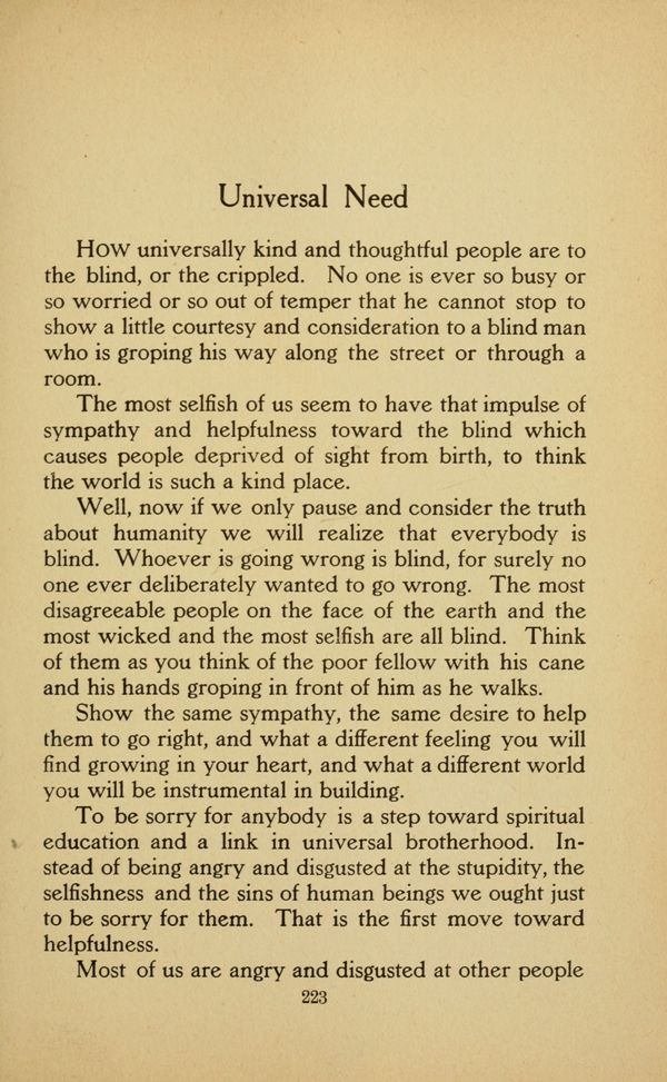 Well, now if we only pause and consider the truth about humanity we will realize that everybody is blind. Whoever is going wrong is blind, for surely no one ever deliberately wanted to go wrong. The most disagreeable people on the face of the earth and the most wicked and the most selfish are all blind. Think of them as you think of the poor fellow with his cane and his hands groping in front of him as he walks.