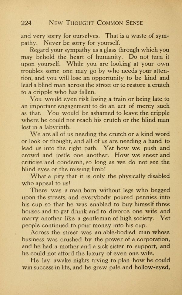 Regard your sympathy as a glass through which you may behold the heart of humanity. Do not turn it upon yourself. While you are looking at your own troubles some one may go by who needs your attention, and you will lose an opportunity to be kind and lead a blind man across the street or to restore a crutch to a cripple who has fallen.