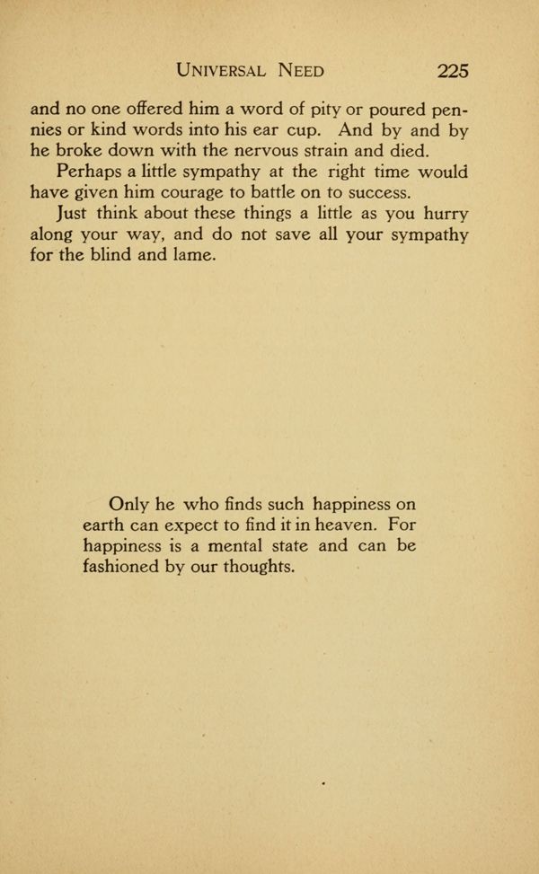 and no one offered him a word of pity or poured pennies or kind words into his ear cup. And by and by he broke down with the nervous strain and died. Perhaps a little sympathy at the right time would have given him courage to battle on to success. Just think about these things a little as you hurry along your way, and do not save all your sympathy for the blind and lame.