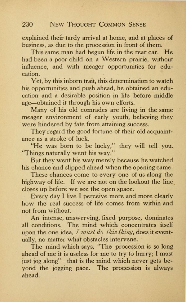 explained their tardy arrival at home, and at places of business, as due to the procession in front of them. This same man had begun life in the rear car. He had been a poor child on a Western prairie, without influence, and with meager opportunities for education.