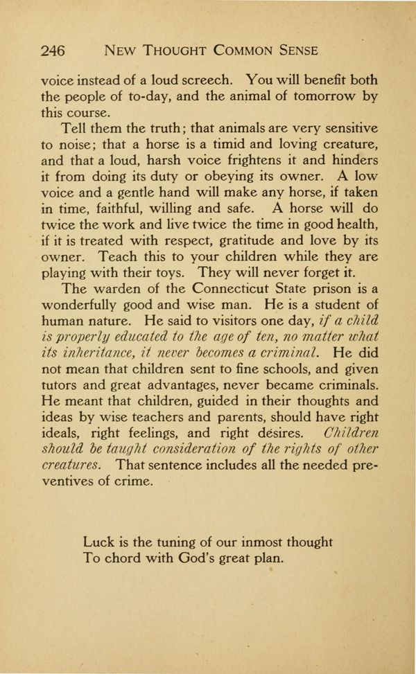 He meant that children, guided in their thoughts and ideas by wise teachers and parents, should have right ideals, right feelings, and right desires. Children should be taught consideration of the rights of other creatures. That sentence includes all the needed preventives of crime.