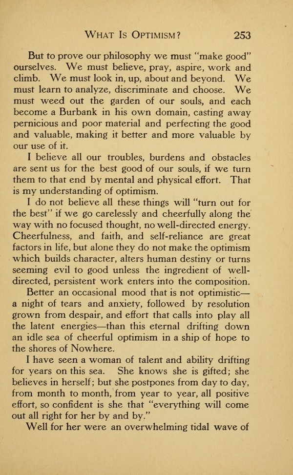 But to prove our philosophy we must "make good" ourselves. We must believe, pray, aspire, work and climb. We must look in, up, about and beyond. We must learn to analyze, discriminate and choose. We must weed out the garden of our souls, and each become a Burbank in his own domain, casting away pernicious and poor material and perfecting the good and valuable, making it better and more valuable by our use of it.
