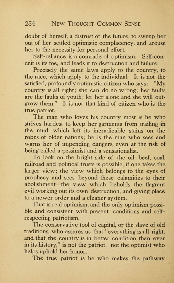 The conservative tool of capital, or the slave of old traditions, who assures us that "everything is all right, and that the country is in better condition than ever in its history," is not the patriot --- not the optimist who helps uphold her honor.