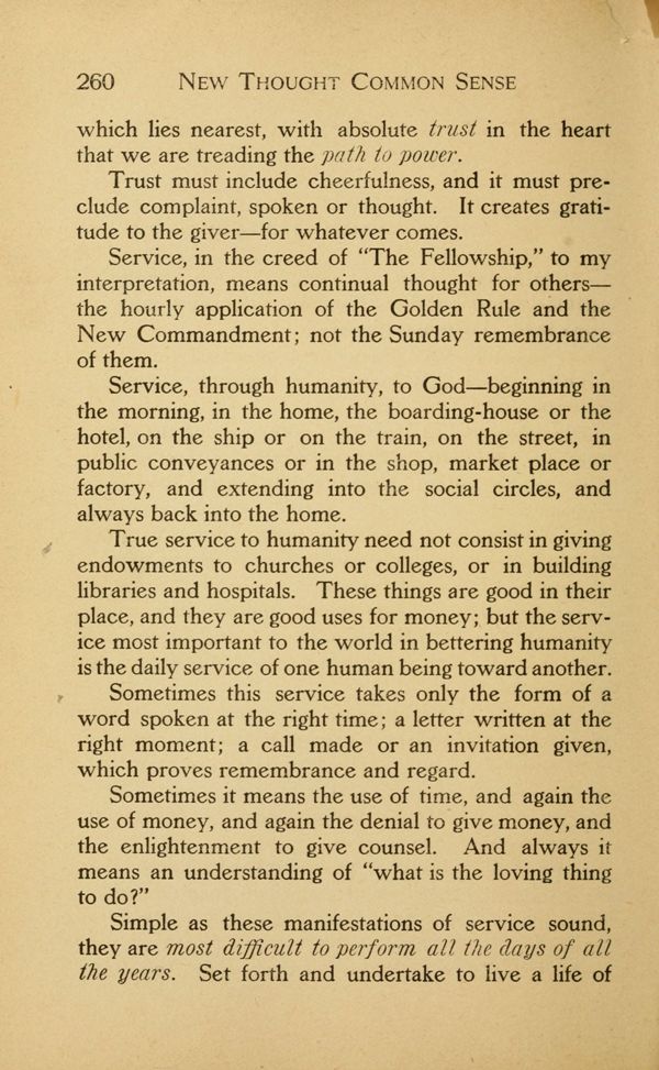 The Ancient Lineage of New Thought - The Anti-toxin of Common Sense - Are You Doing the Best You Can? - Be Not Easily Offended - For What Are You Living? - Ignore Misfortune - The Power of Personality - Common Sense and "Goodness" - "Good Business" - The Trapeze Performer - The High Calling of Fatherhood - The High Calling of Motherhood - Thought Building for Children - The New Thought Economy - What Is a Good Woman? - The Color of Your Thoughts - "In God We Trust" - Are You Alive? - Something About Celibacy - The Old and the New Thought View of Life - The Cities Beyond - The Onward March - Common Sense Ideas in Marriage - The Shading of the Picture - Woman and the Cigarette - Sinning Against the "Holy Ghost" - New Thoughts and Beauty - Famous and Infamous Women - Enemies to Happiness - The New Year - Enthusiasm - Brace Up - Universal Need - Every Day Opportunities - The Masters - Building Kindness Cells - What Is Optimism? - What Is the Loving Thing to Do? - A New Thought Rosary - Unto the End - Keep Still and Wait - What Life Means to Me - Contents - Index