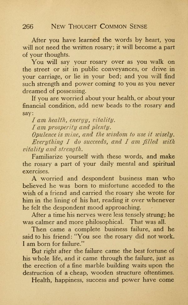 A worried and despondent business man who believed he was born to misfortune acceded to the wish of a friend and carried the rosary she wrote for him in the lining of his hat, reading it over whenever he felt the despondent mood approaching.