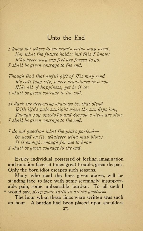 Many who read the lines given above, will be standing face to face with some seemingly insupportable pain, some unbearable burden. To all such I se would say, Keep your faith in divine goodness.